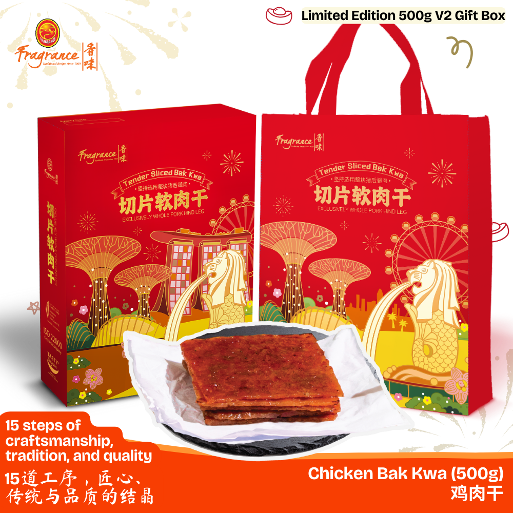 Our Chicken Bak Kwa is made using whole chicken meat, carefully prepared and trimmed to remove skin, excess fats, and connective tissues before slicing. The meat is double-sliced prior to grilling, resulting in a softer, more tender bite.
